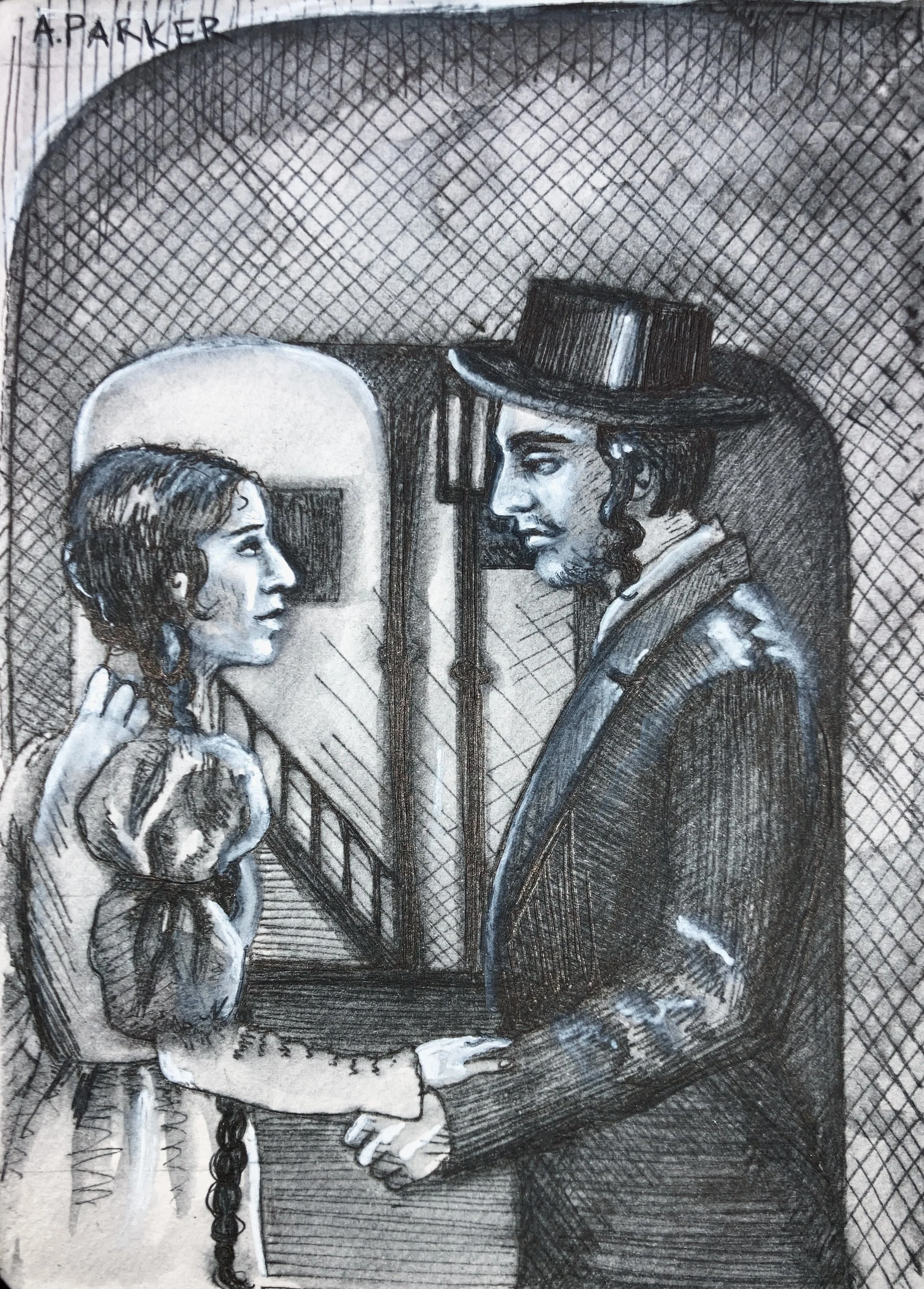 "Leah and Khonen Meet." Pen and ink. From the film "Der Dybukk."
