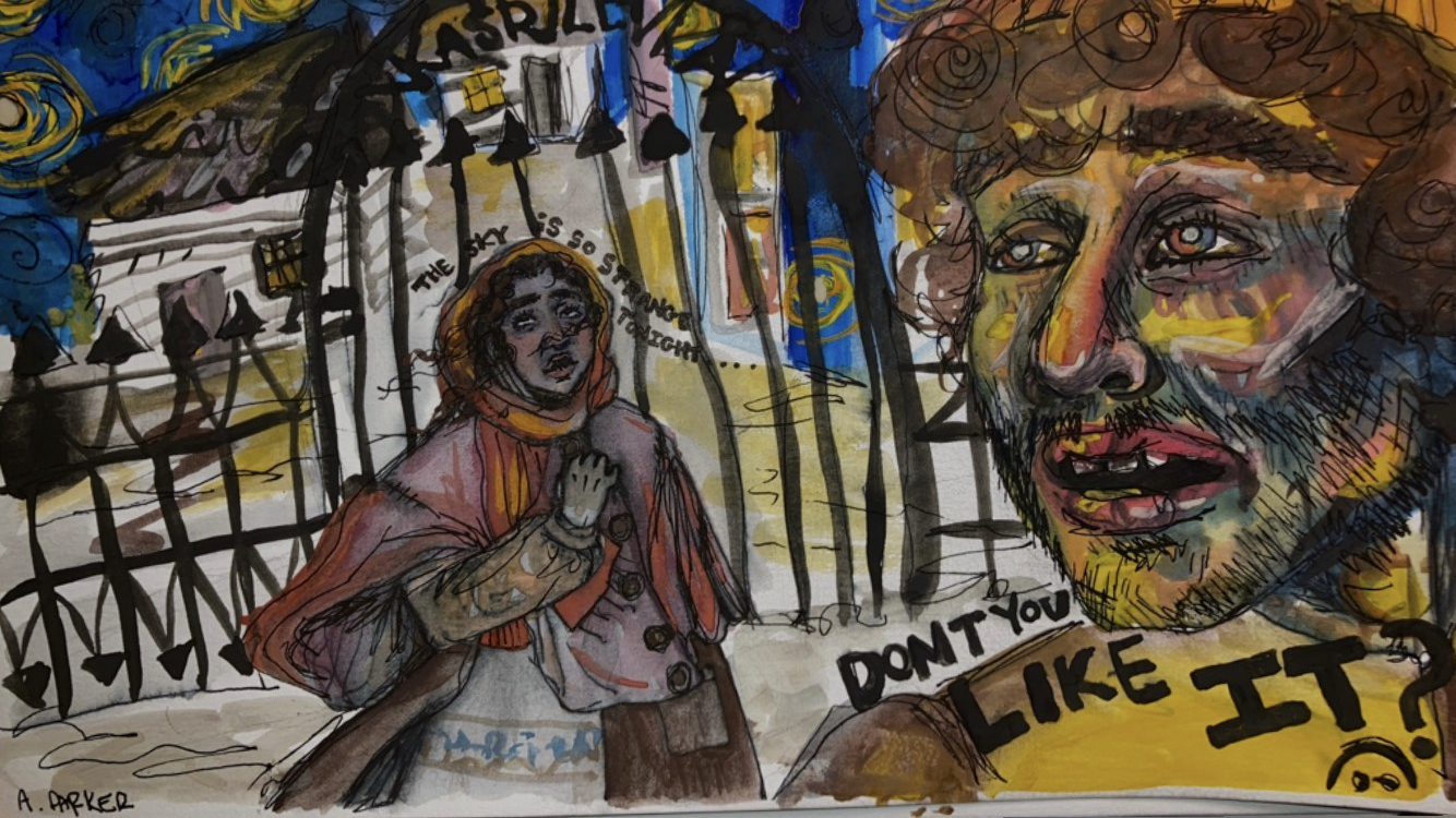 "Theater at the Displaced Persons Camp." Prismacolor, acrylic, mixed media. Europe, 1946.