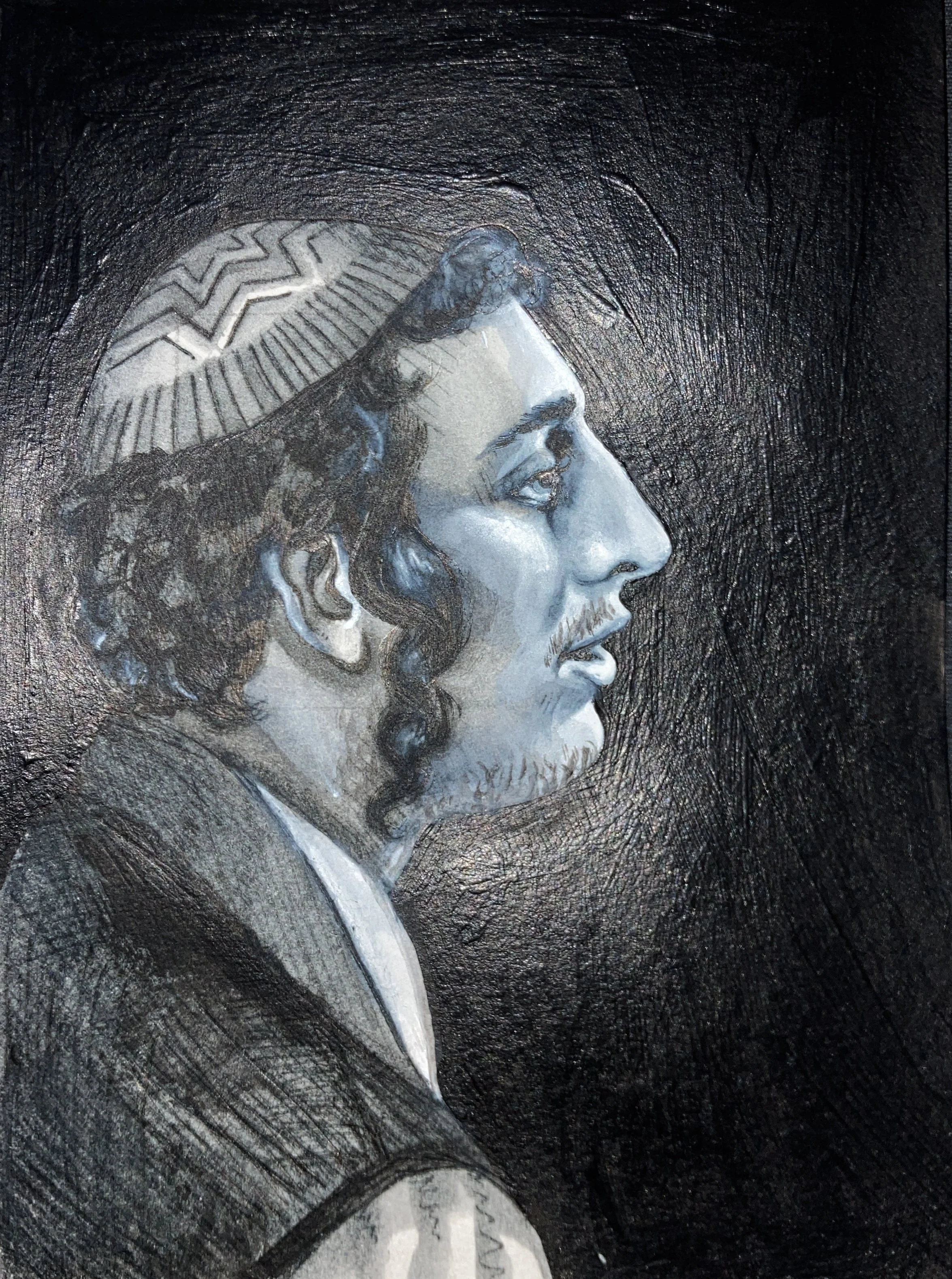"Khonen." Pen and acrylic. Leon Liebgold in "Der Dybukk."